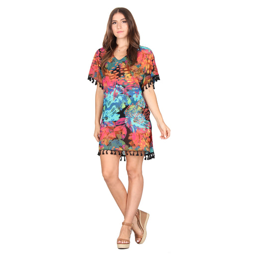 FEATURES Lightweight V-neck Kimono sleeves Tassel trim Side slits Open back crisscross Stretchy fabric Pullover styling Great for spring and summe...