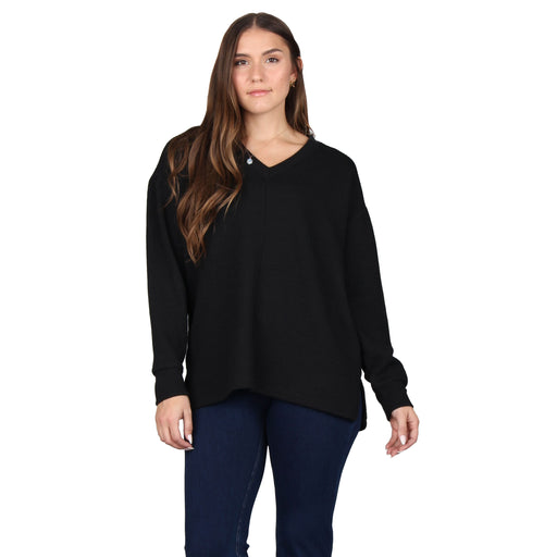 FEATURES V-neck Long sleeves Slits on both sides of the bottom Ribbed neckline and cuffs Loose fit Super soft & stretchy fabric Pullover styli...