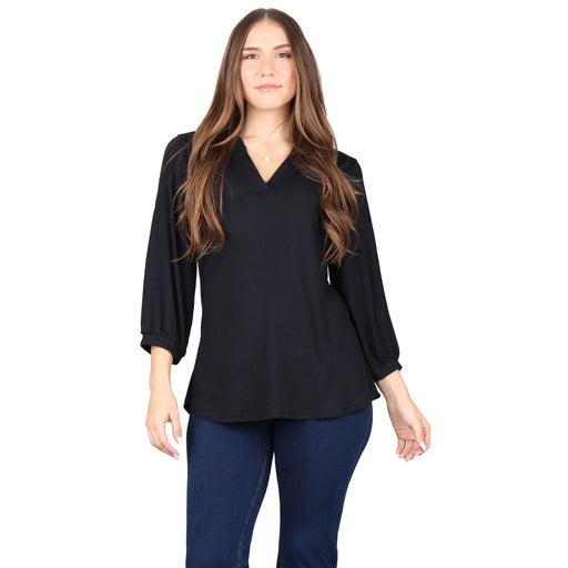 FEATURES • Split V-neckline • ¾ Puff sleeves • Curved hem • Back yoke with pleat detail • Loose-fitting design •...