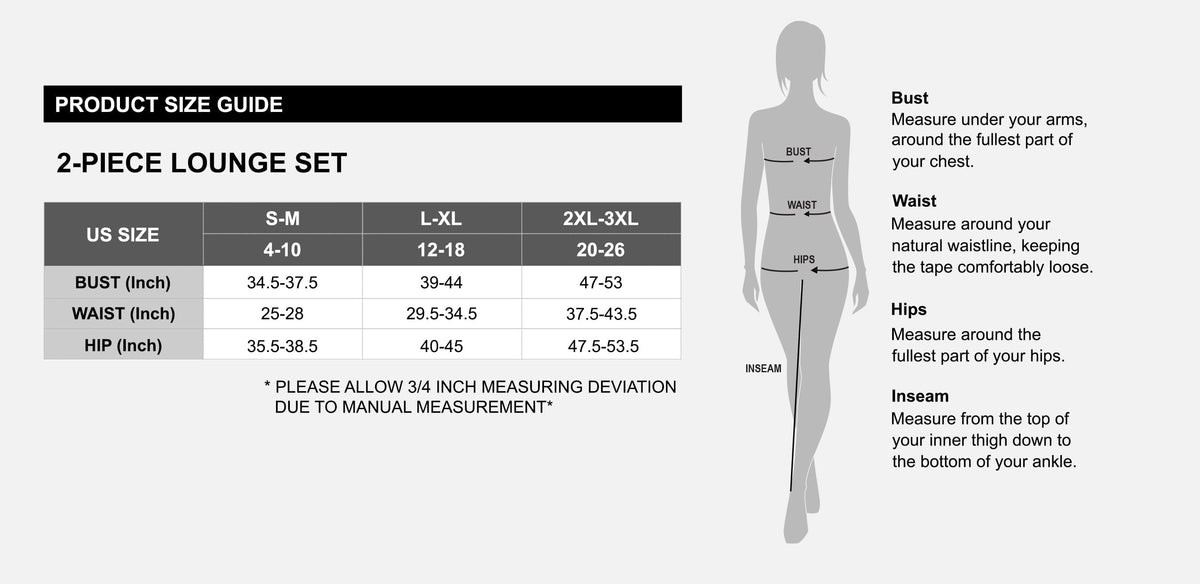 - L-XL (Size 12-18, Bust 39”-44”, Waist 29.5”-34.5”, Hip 40”-45”)