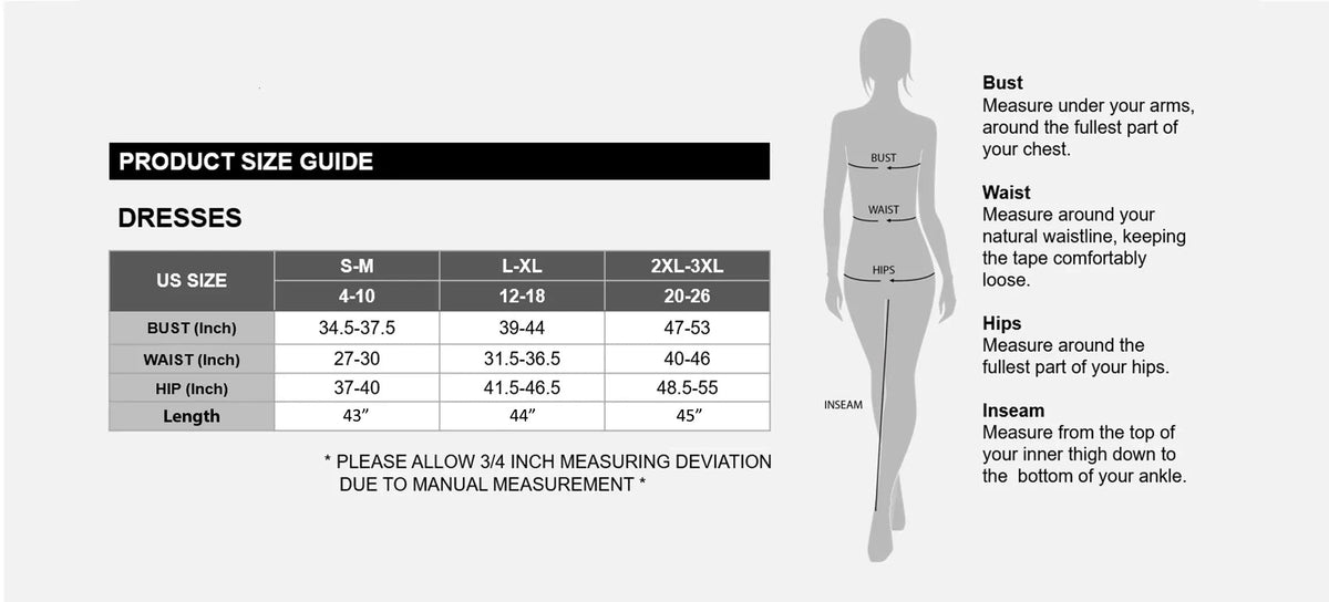- 2XL-3XL (Size 20-26, Bust 47”-53”, Waist 40”-46”, Hip 48.5”-55”, Length 45")
