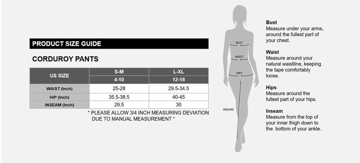 - L-XL (Size 12-18, Waist 29.5”-34.5”, Hip 40”-45”, Inseam 31”)