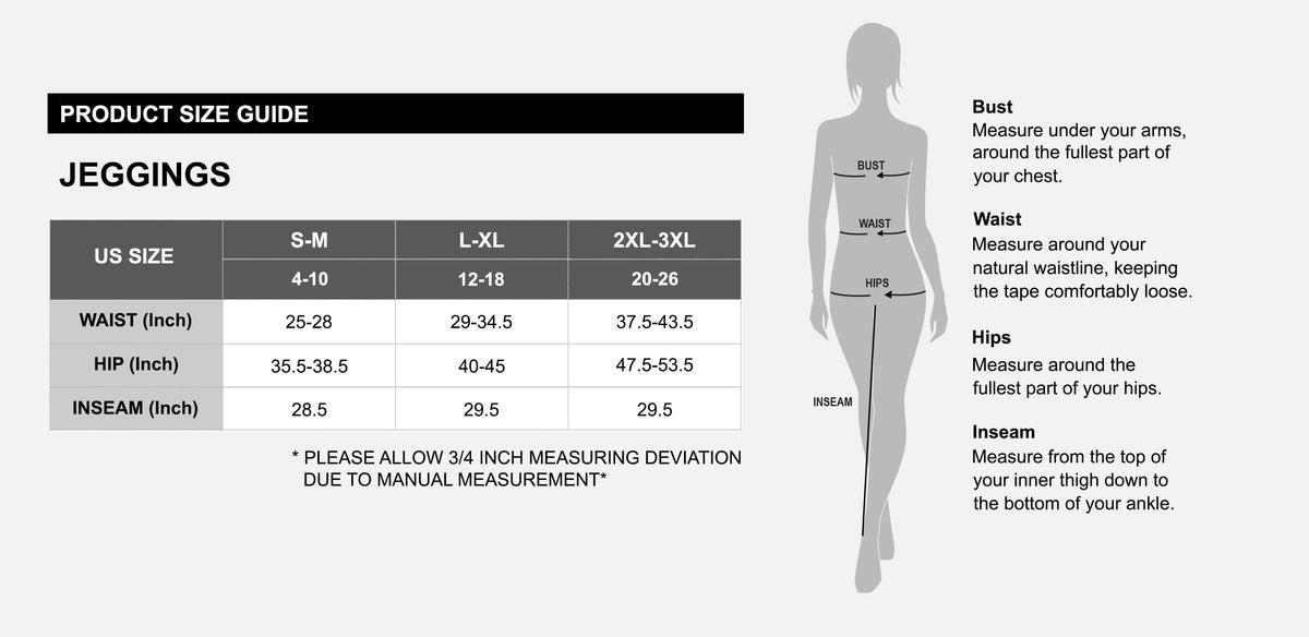 • 2XL-3XL (Size 20-26, Waist 37.5”-43.5”, Hip 47.5”-53.5”, Inseam 29.5”)