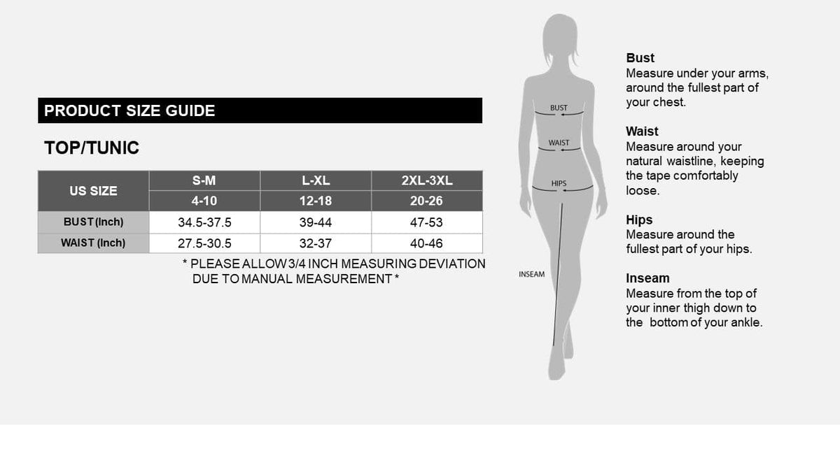 - 2XL-3XL (Size 20-26, Bust 47”-53”, Waist 40”-46”)