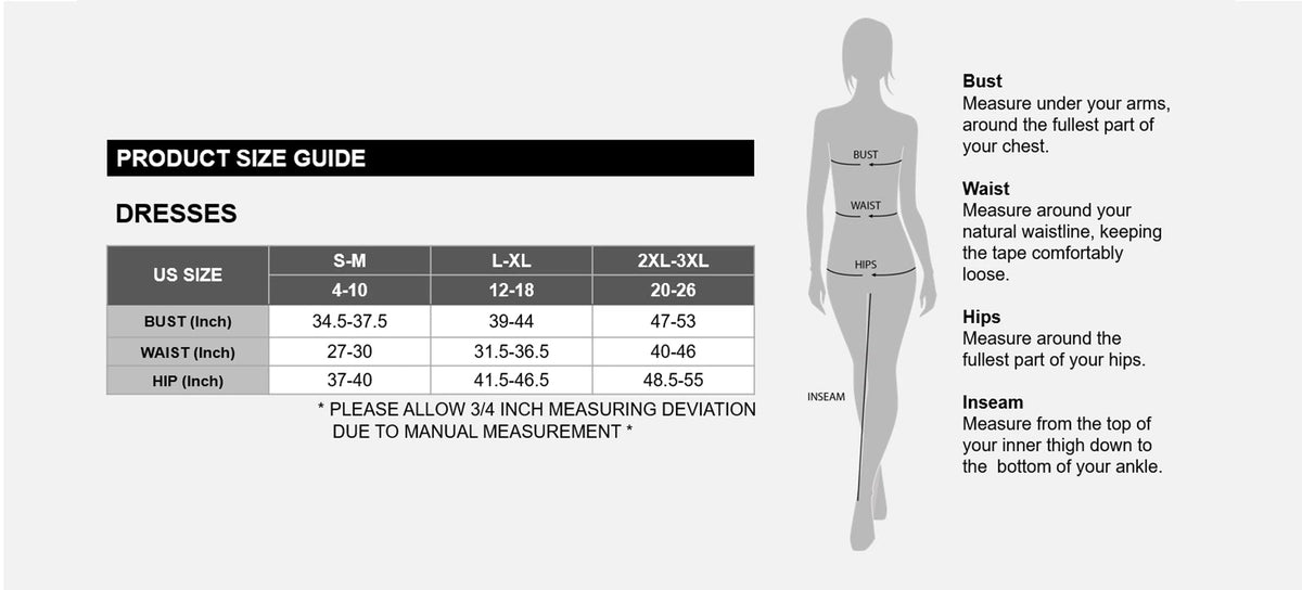 - 2XL-3XL (Size 20-26, Bust 47”-53”, Waist 40”-46”, Hip 48.5”-55”)